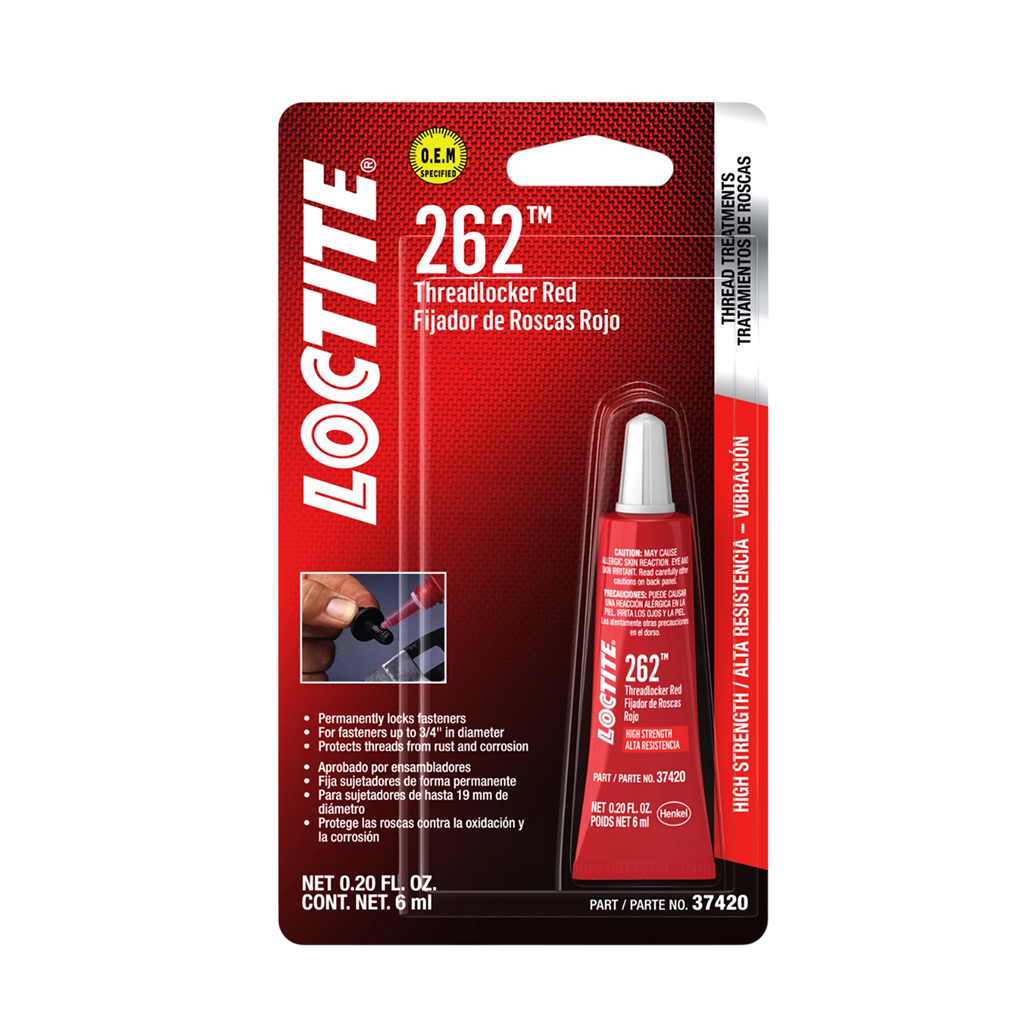 Resistencia Alta. Fijador de color rojo. Es aplicado en tornillos de hasta 3/4 (20 mm) antes del ensamble. Diseñado para fijar ensambles que deben soportar grandes impactos, vibración o severas condiciones ambientales o quimicas. Requiere de herramientas manuales y calor localizado para separar las partes. Resistente a solventes. Necesita primer. Aplicaciones Sugeridas Ensamble con herramientas neumáticas, tornillería en monoblock, transmisiones, tornillos limpios de acero al carbón, etc.