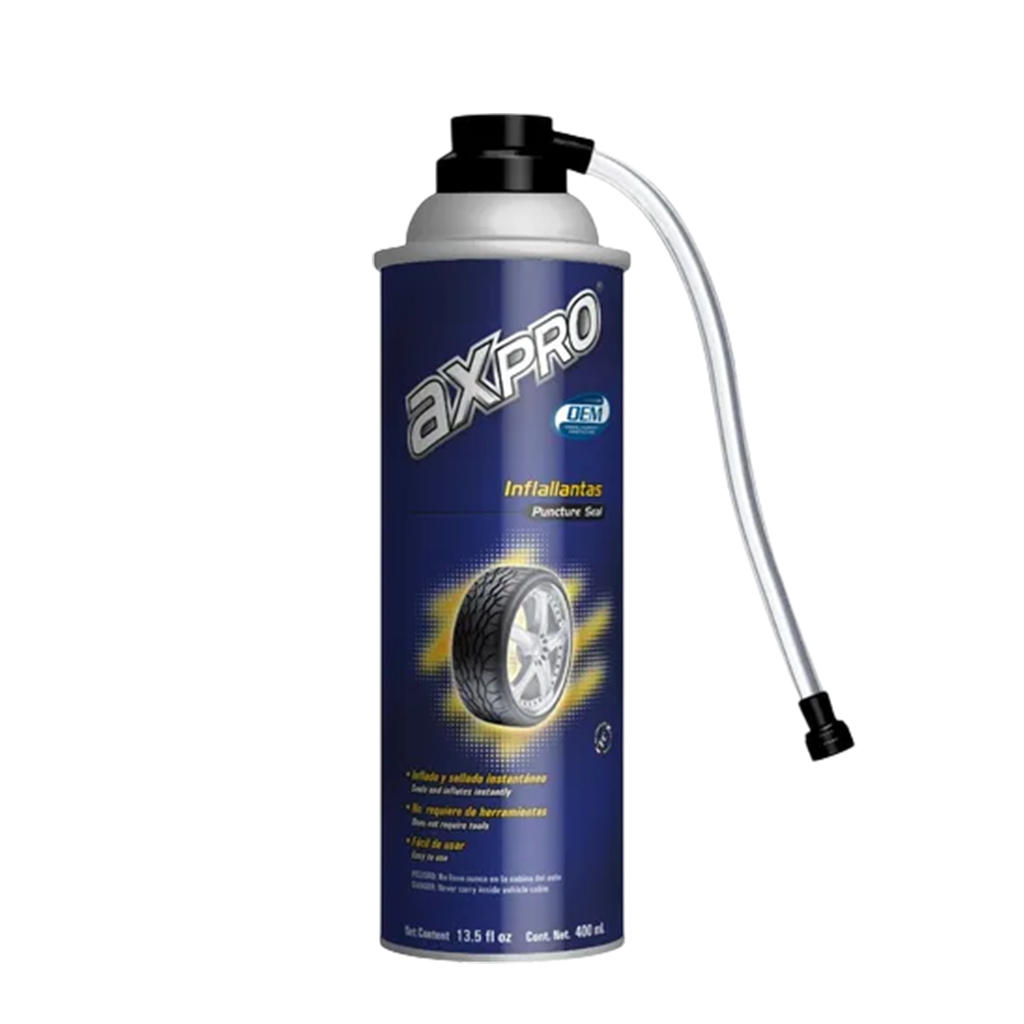 Inflallantas Axpro es la solución fácil a una llanta ponchada. Sella e infla en poco tiempo sin necesidad de herramientas especiales. Simplemente conecte la manguera hasta terminar el producto. Reanude su viaje a la llantera más cercana.